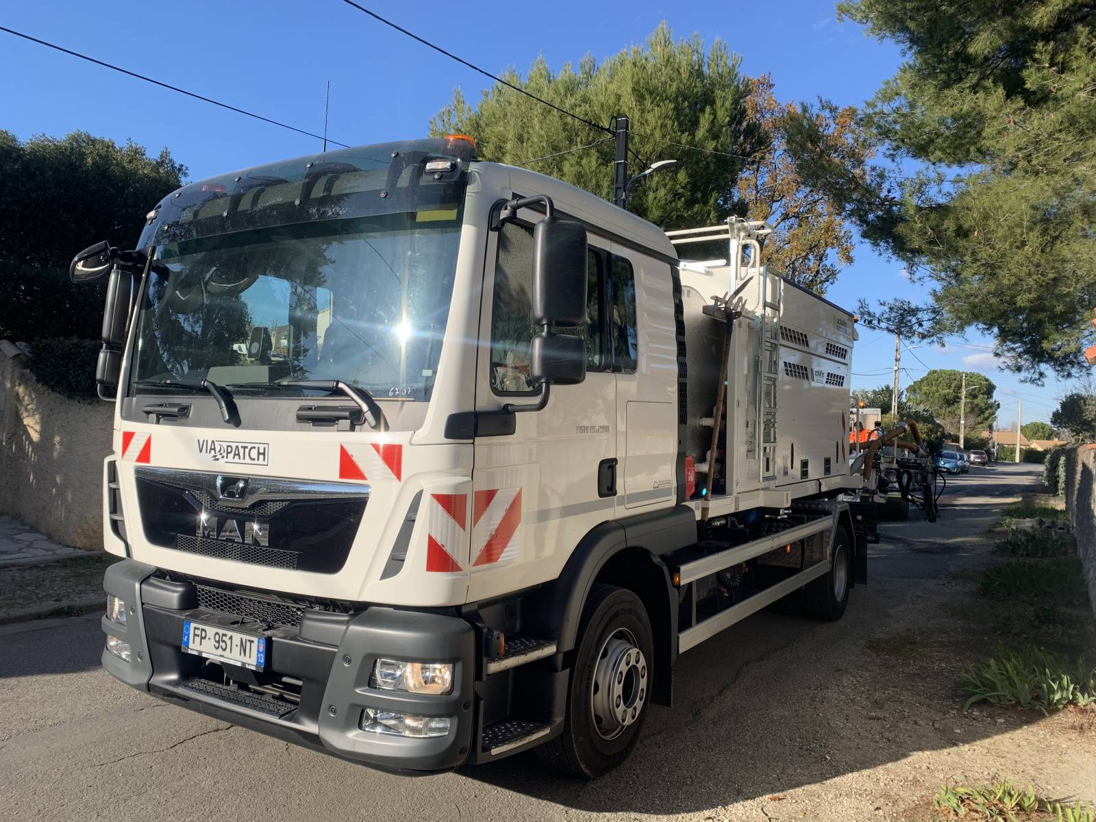 Notre atelier BLOW-PATCHER en location journalière sur Moriéres-Les-Avignons, dans le Vaucluse, avec chauffeur et techniciens, pour la réparation d'une voirie fortement abîmée.