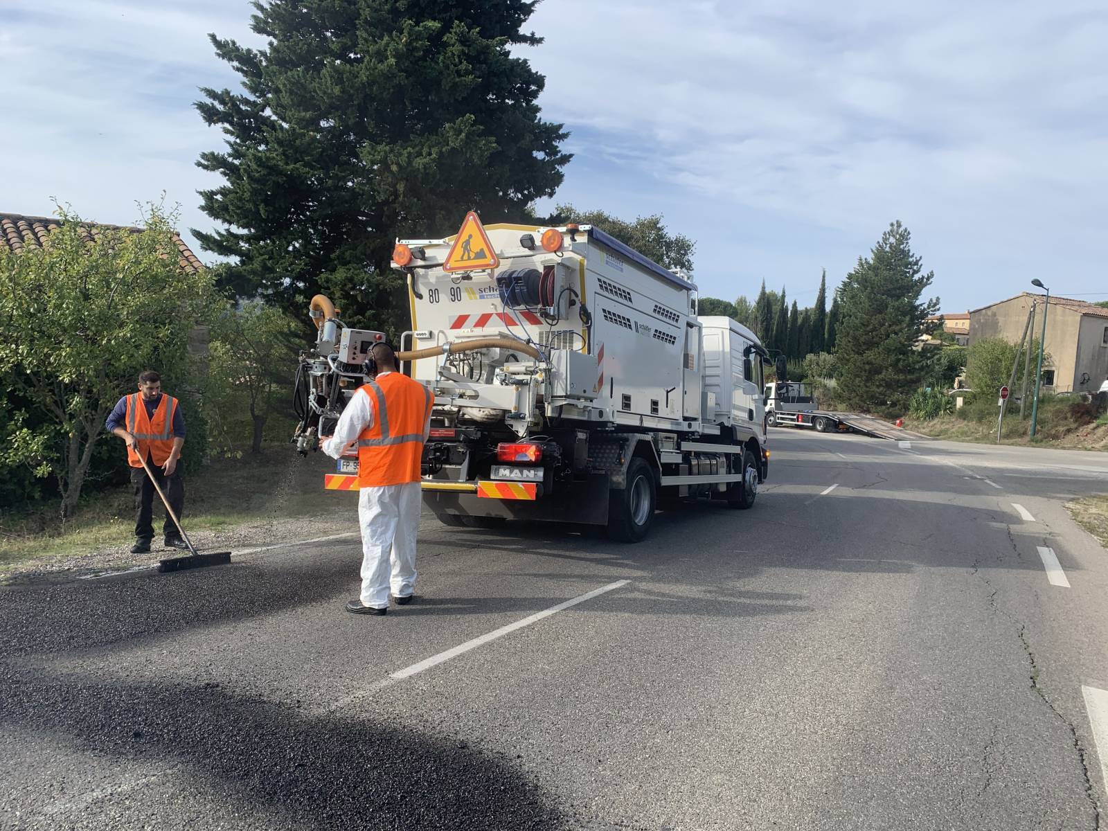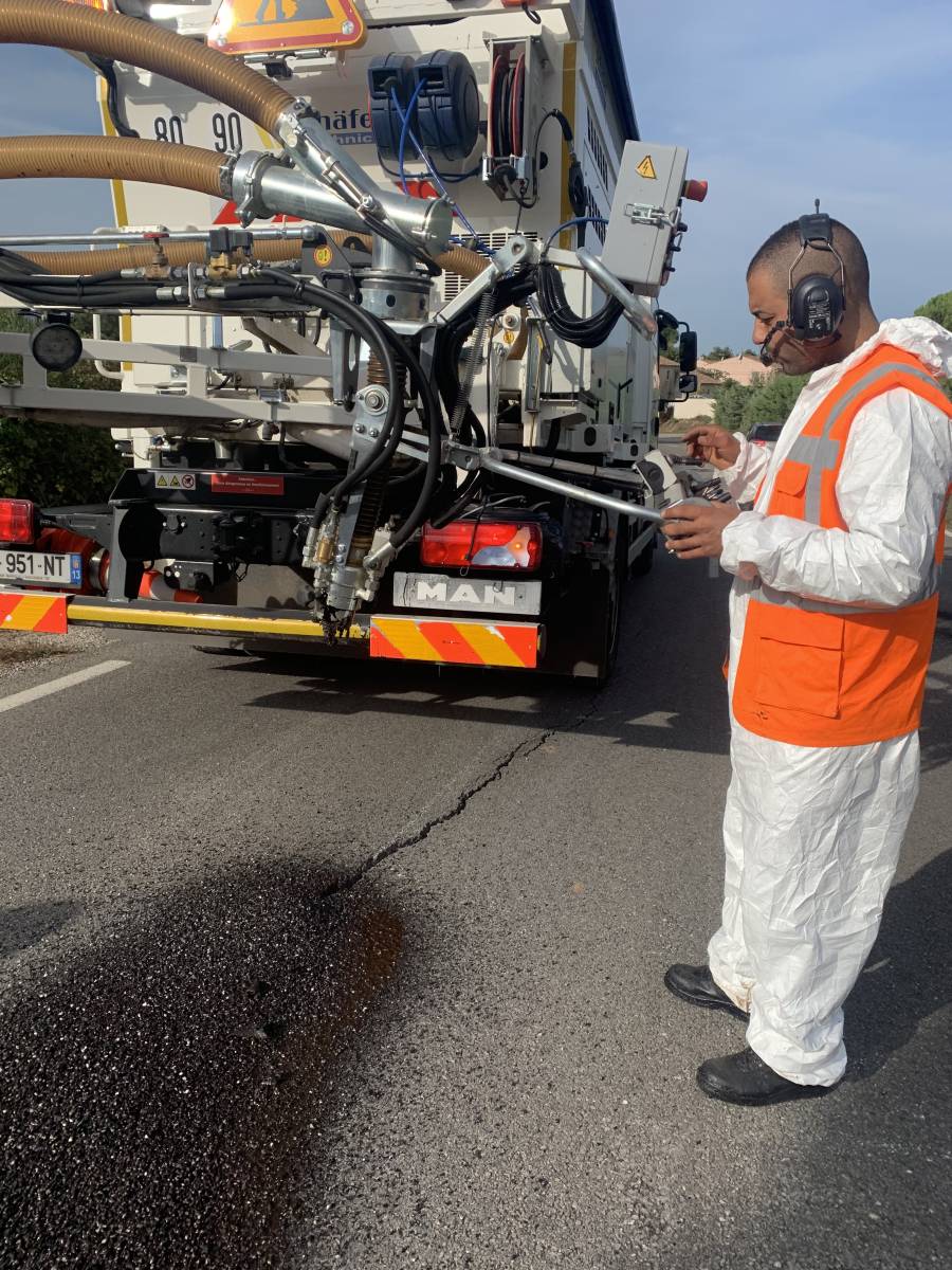 En location journalière, le BLOW-PATCHER notre enrobeur projeteur et son atelier, comprenant chauffeur, techniciens, compacteur, a réaliser des réparations sur la voirie, fissure, nid de poule, bord de chaussée, faïençage...