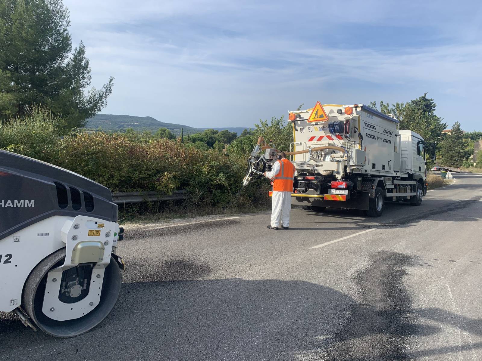 Il fabrique en un seul passage différents enrobés projetés en fonction du type de dégradation. Après que la surface réparée soit compactée, la voirie est immédiatement autorisée à la circulation.