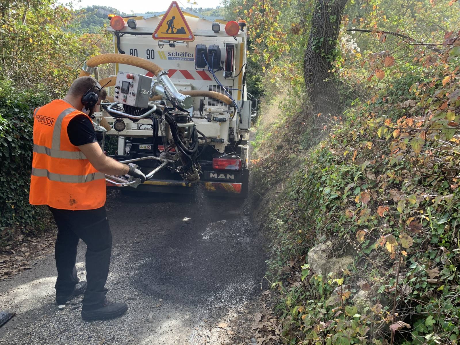 Il y a aussi un dispositif de pulvérisation d'eau, pour enlever le maximum de feuilles, poussière... Par la suite, il y a la pulvérisation d'un liant, une émulsion de bitume pour créer une couche d'accroche optimale. Puis, vient le remplissage avec un mélange d'émulsion et de gravillons, le remplissage en enrobé projeté, avec du gravillons de qualité, du 6/10 sur la partie inférieure et du gravillons plus fin, en 2/4 ou 4/6 sur la partie supérieure.